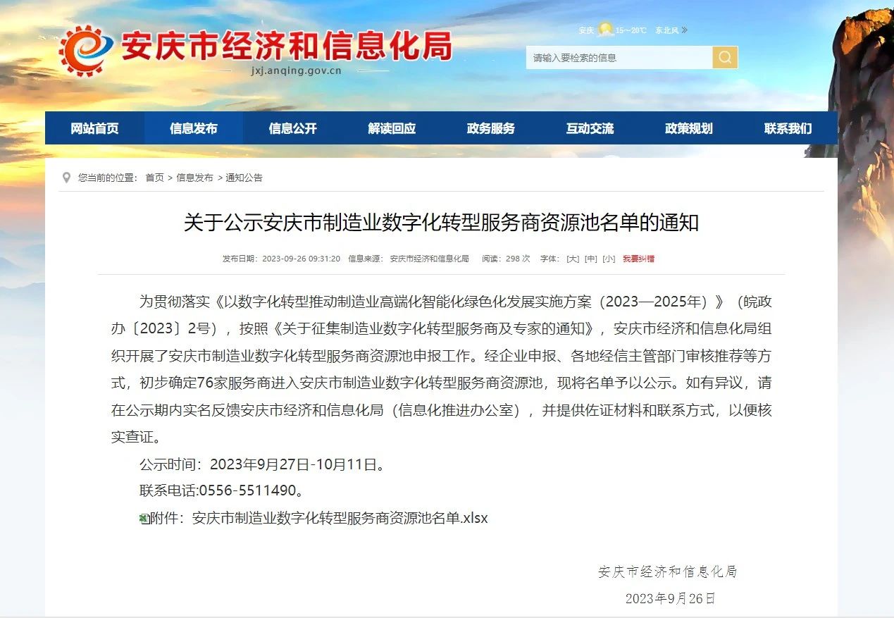 欧陆注册头条 | 入选《安庆市制造业数字化转型服务商资源池》
