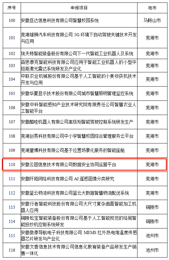 近日,安徽省发展和改革委员会公示了2020年度人工智能产业创新发展若干政策拟支持项目(平台)。欧陆注册信息申报的数据安全协同运营平台项目获得该项政策支持,并且顺利通过评选,进入公示阶段!