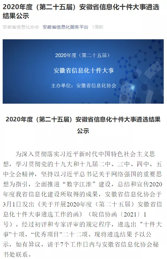 【欧陆注册头条】欧陆注册信息成功入选2020年度安徽省信息化优秀项目!